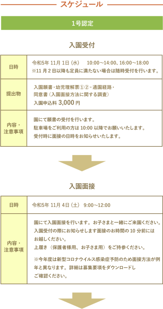 | 内容・ 注意事項 | 園にて入園面接を行います。お子さまと一緒にご来園ください。 入園受付の際にお知らせします面接のお時間の10分前にはお越しください。 上履き(保護者様用、お子さま用)をご持参ください。 ※今年度は新型コロナウイルス感染症予防のため面接方法が例年と異なります。詳細は募集要項をダウンロードしご確認ください。 |