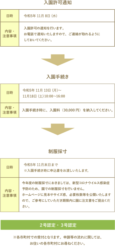 入園許可の通知を行います。 お電話で通知いたしますので、できる限り日中でもご連絡が取れるようにしておいてください。 |