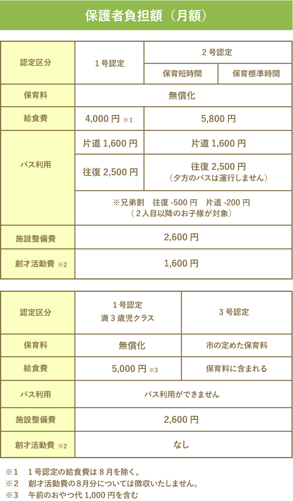 ※1 1号認定の給食費は8月を除く。 ※2 創才活動費の8月分については徴収いたしません。 ※3 午前のおやつ代1,000円を含む