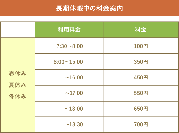 | 春休み 夏休み 冬休み | 7:30~8:00 | 100円 |